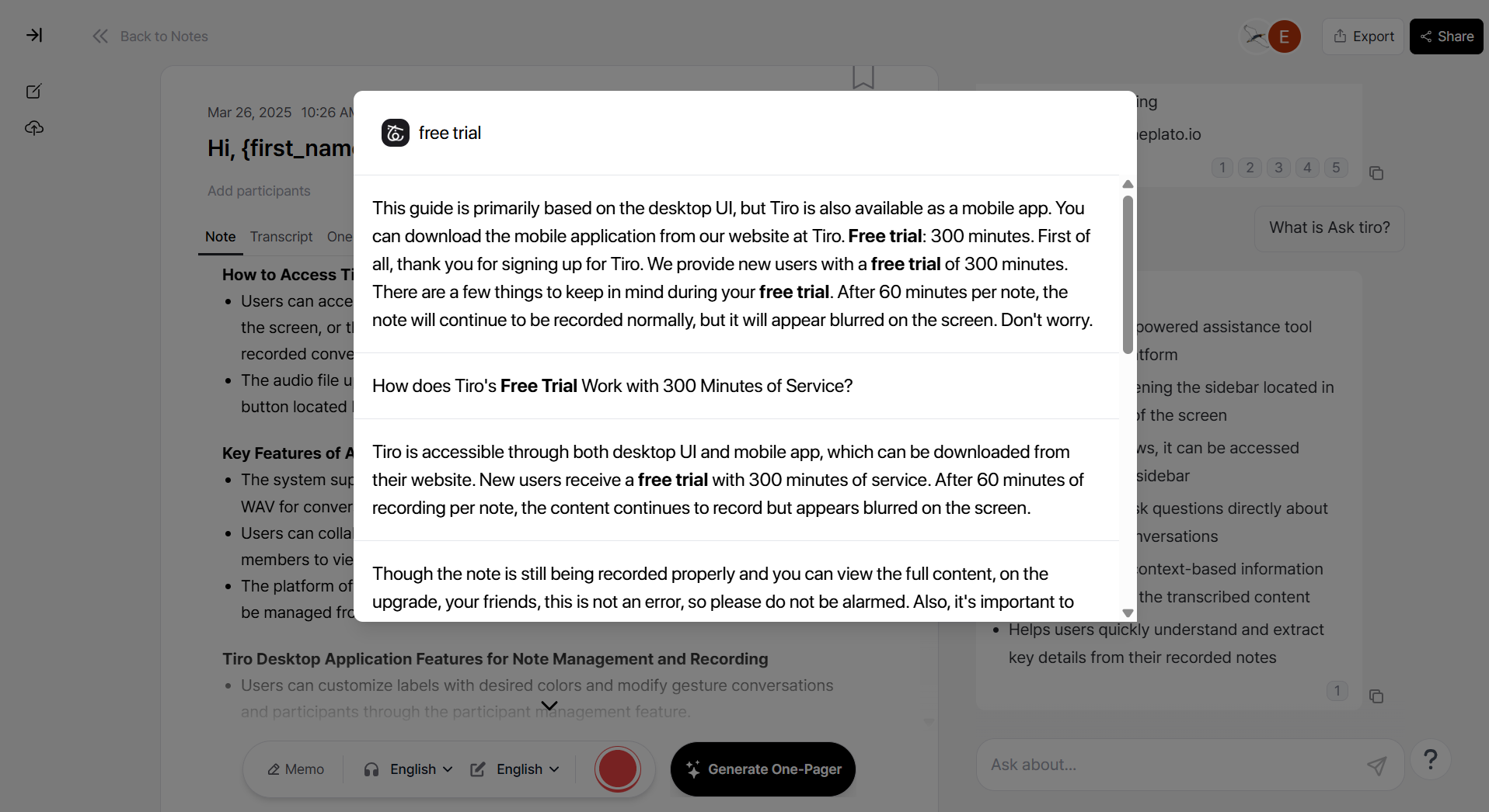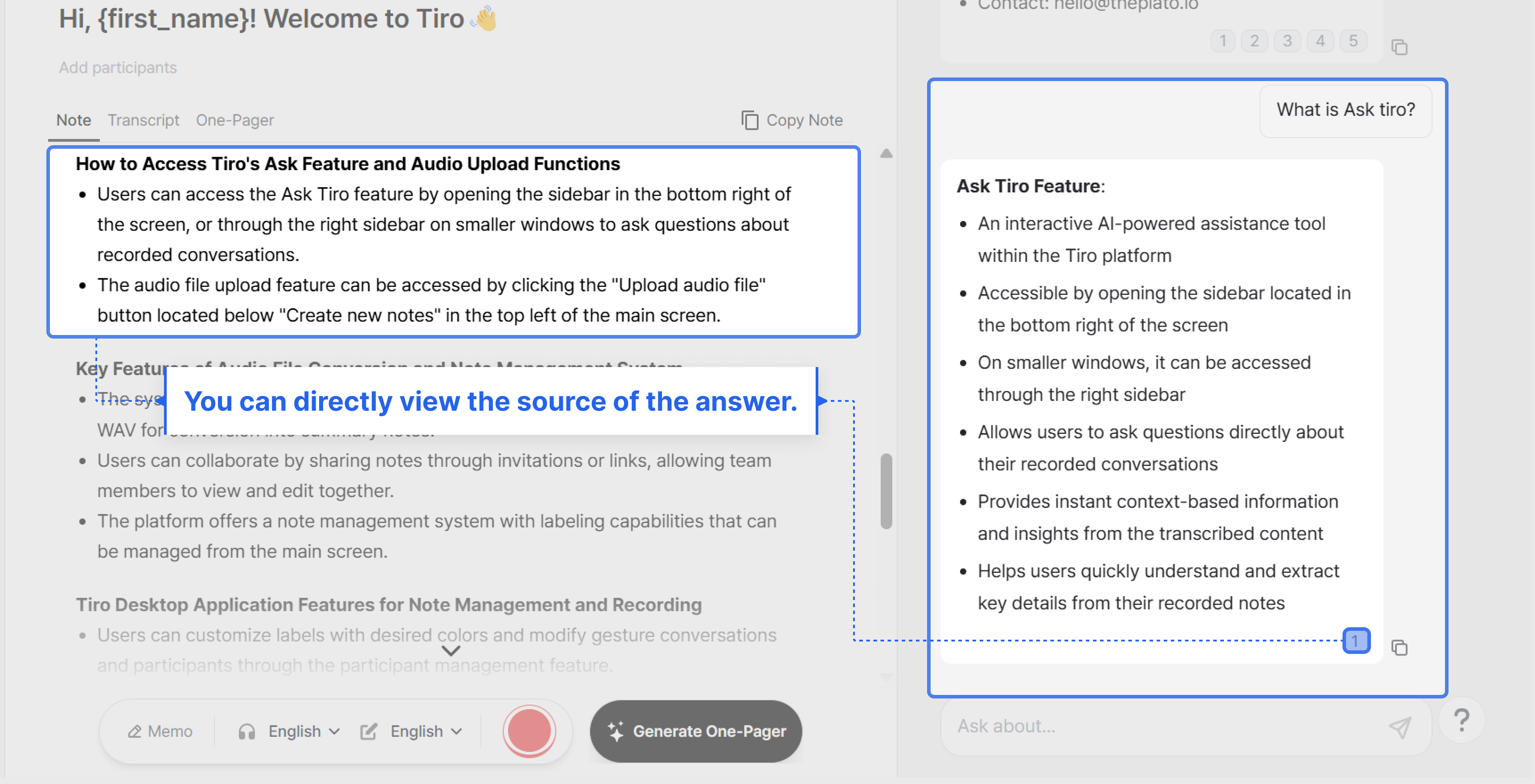 Ask Tiro helps you quickly find information from your notes without reading everything. Just type your question, and Tiro provides an immediate answer based on your notes.