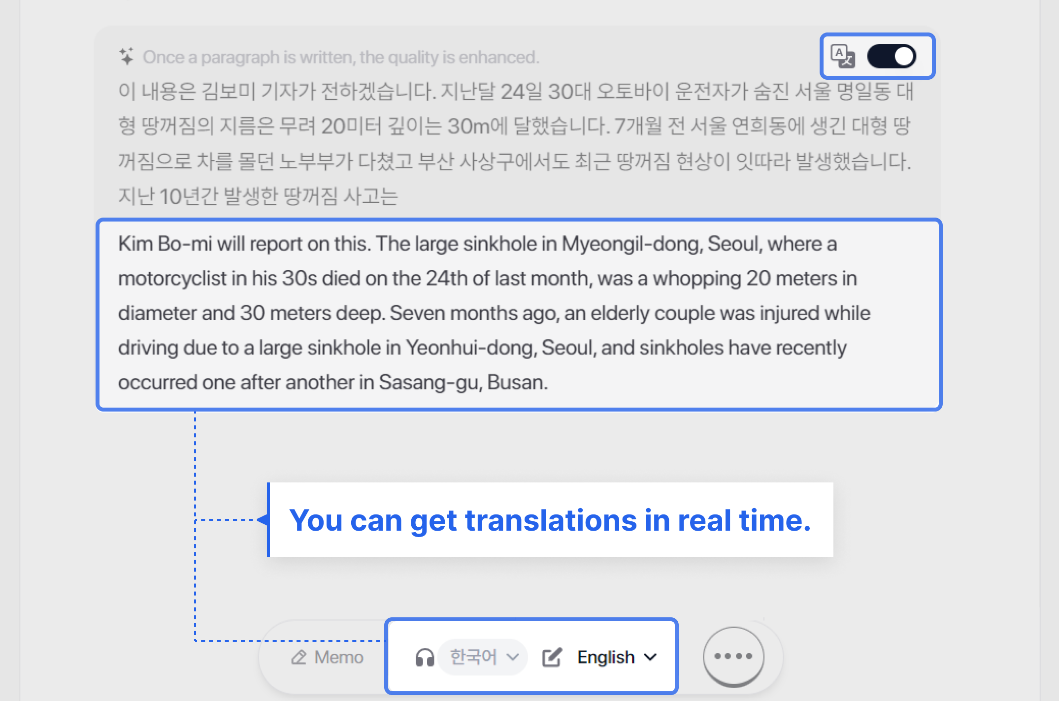 Turn on the real-time translation toggle located at the top-right corner of the paragraph being transcribed. View translations instantly as speech occurs!