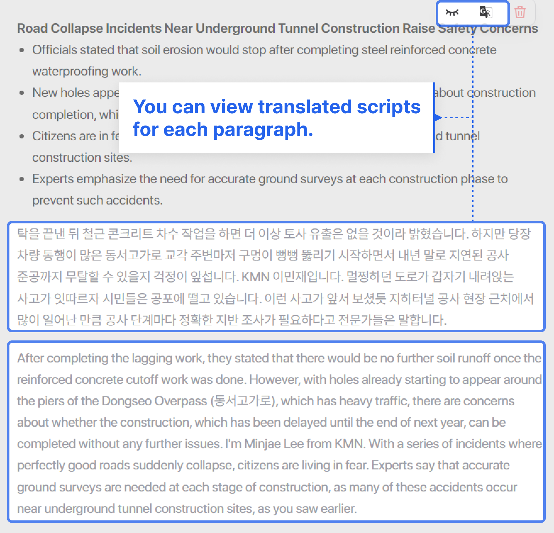 Once the final paragraph is transcribed, click the translation button to view the entire paragraph translation at your convenience.