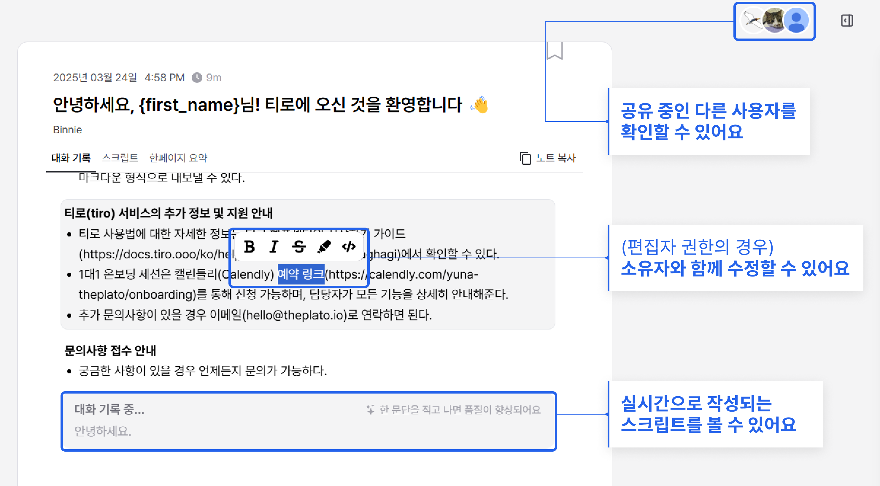 노트를 미리 팀원에게 공유해둔 뒤, 녹음을 시작하면 실시간으로 대화 내용을 함께 볼 수 있어요.
