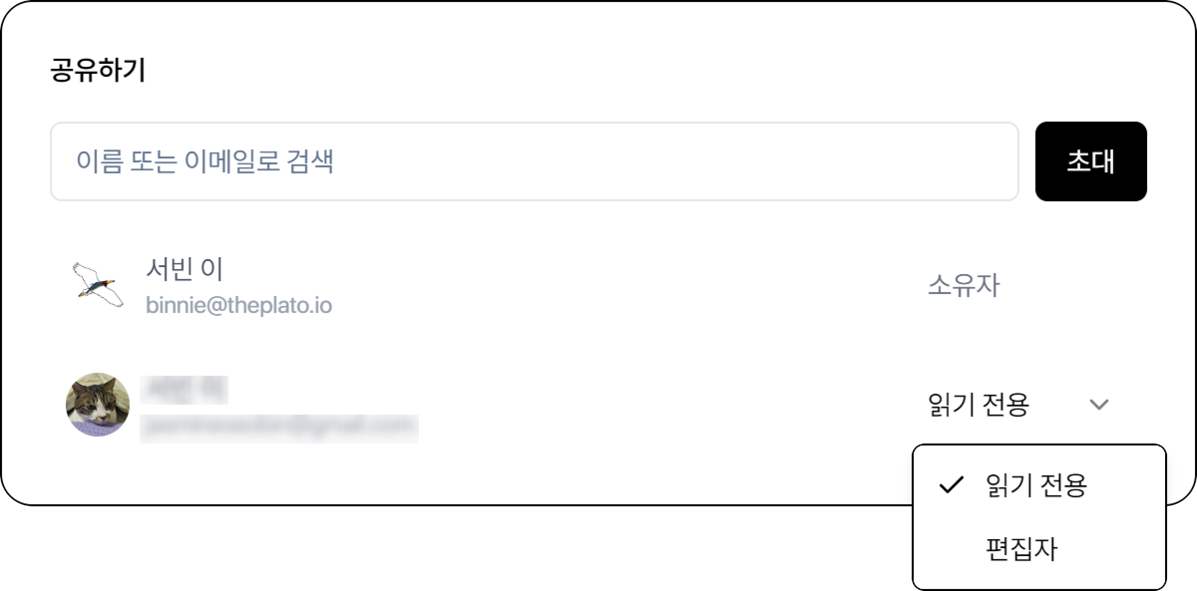 노트 소유자가 초대된 공동 작업자들에게 읽기전용, 편집자 권한을 부여할 수 있습니다.
