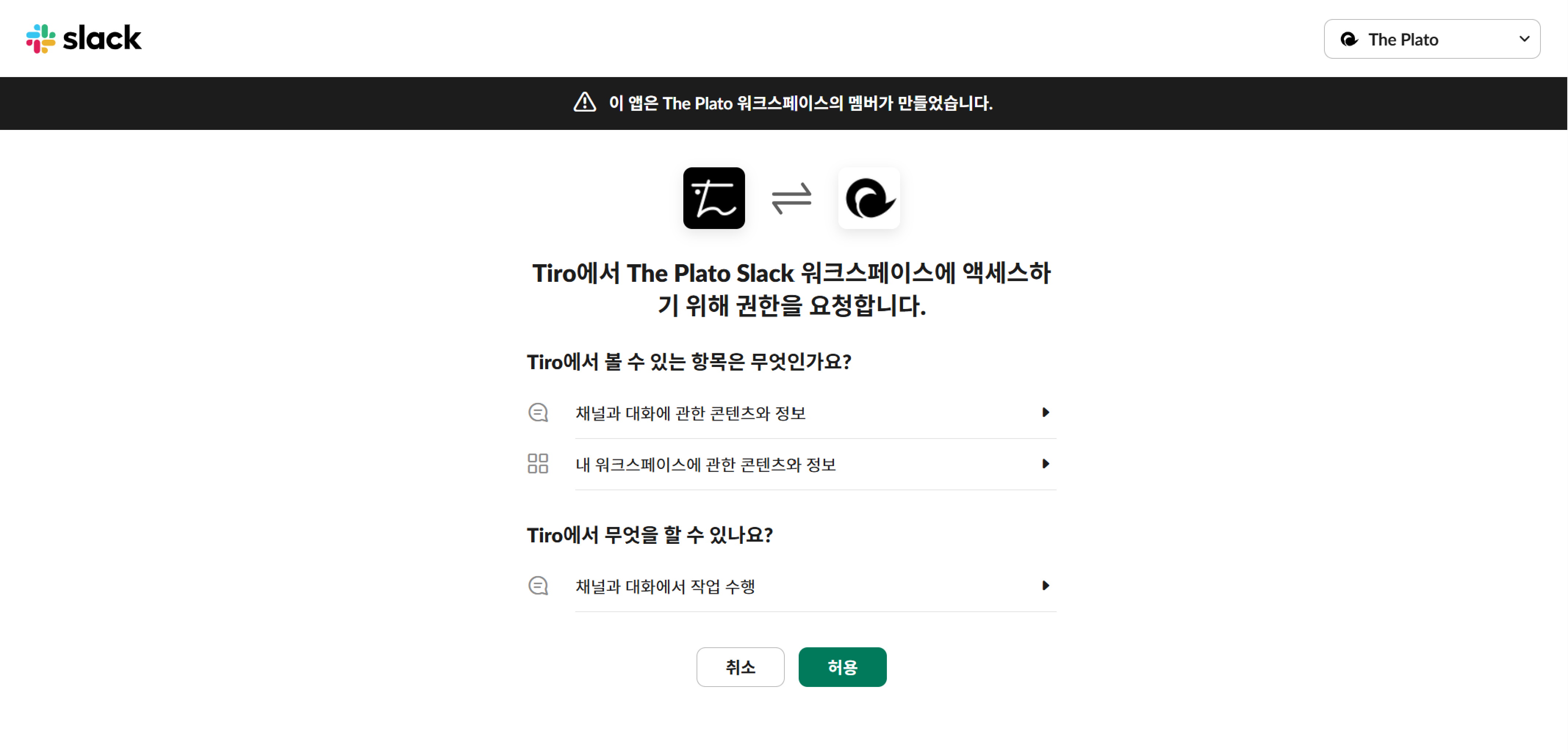 새로 뜨는 창에서 연결할 Slack 계정으로 로그인합니다. 로그인 후 아래 페이지에서 허용을 선택합니다. 연동이 완료되면, Slack에 Tiro 봇이 추가됩니다.