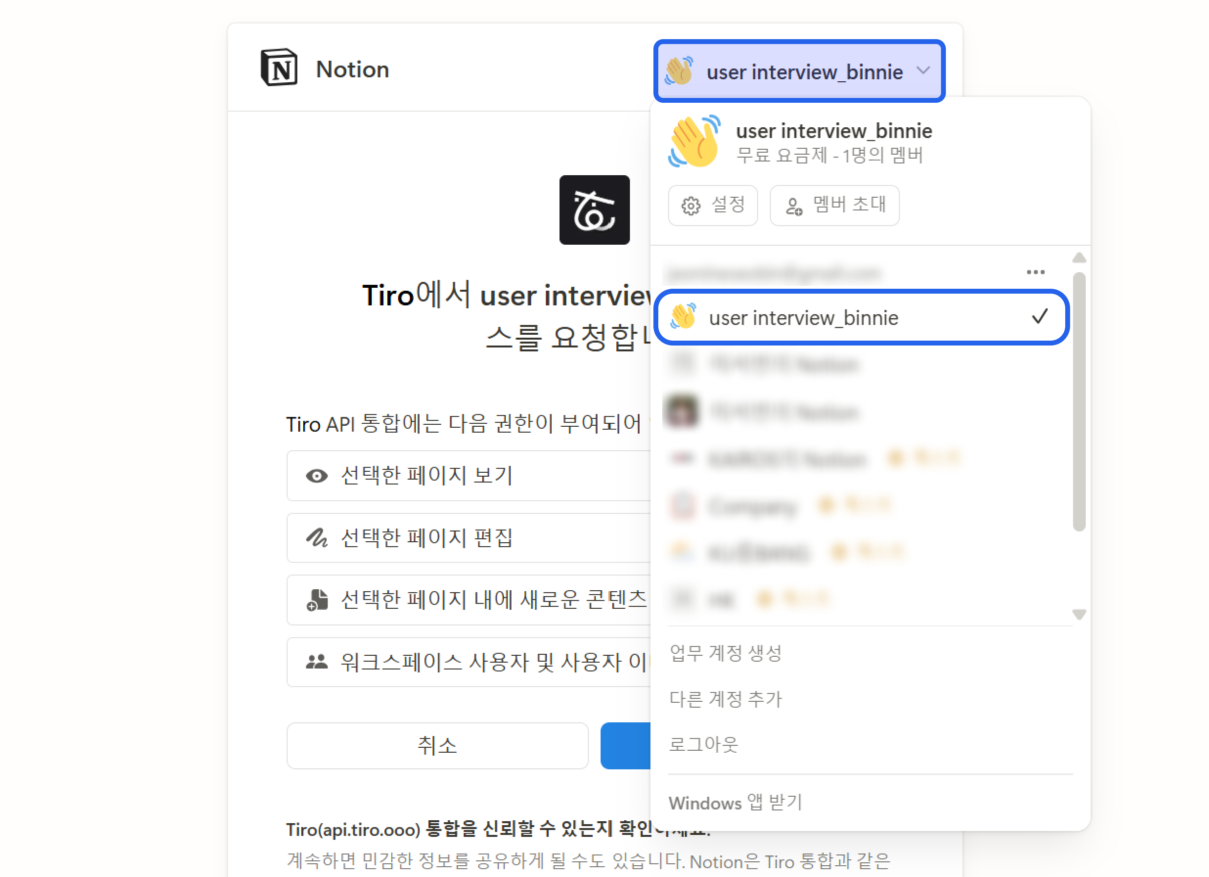 새로 뜨는 창에서 연결할 Notion 계정으로 로그인합니다. 로그인 후 아래 페이지에서 연결하려는 워크스페이스를 선택합니다. 연동이 완료되면, 선택한 워스크페이스로 노트를 자동으로 내보낼 수 있습니다.