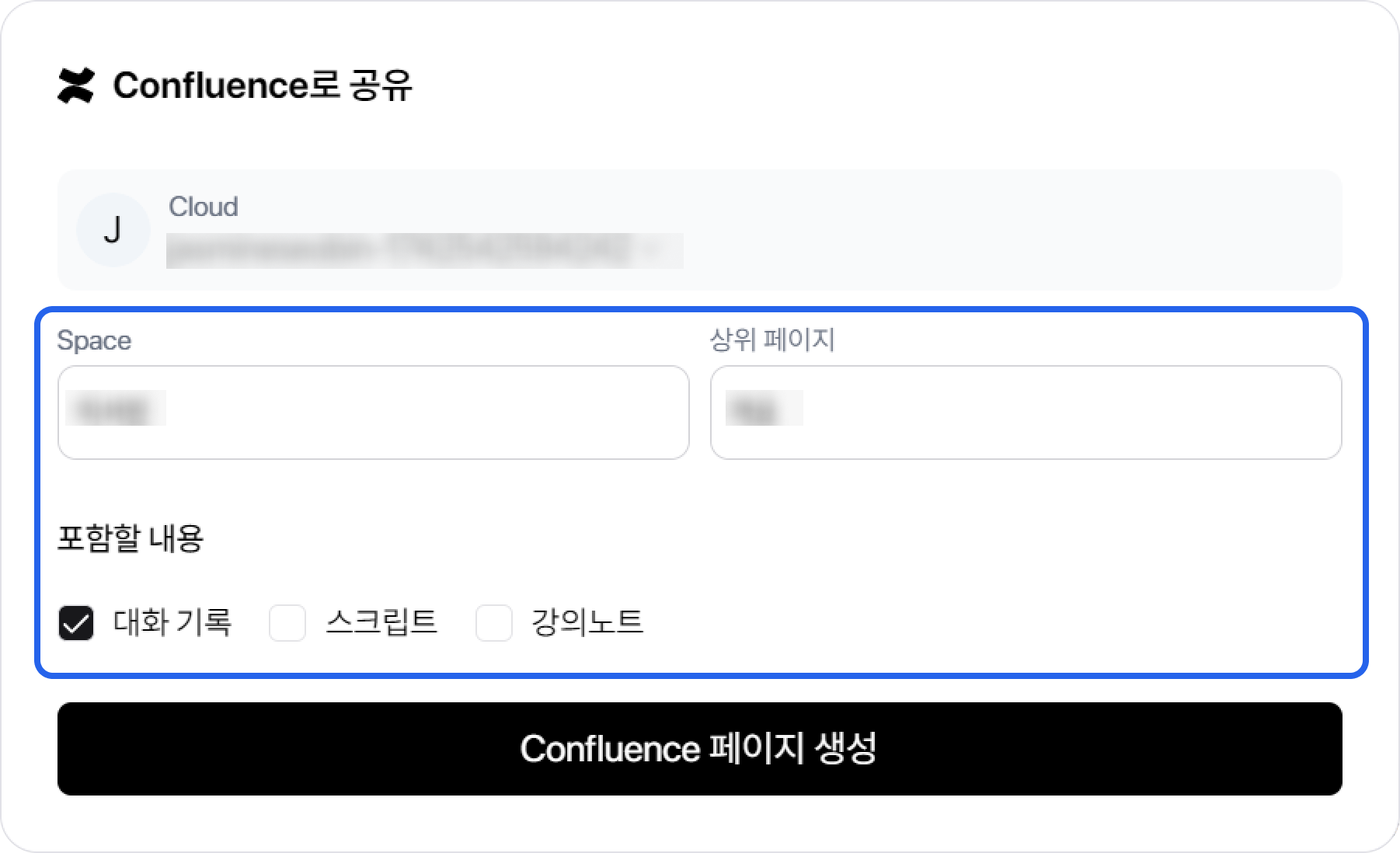 내보내기 > Confluence 를 선택하면 아래와 같은 팝업이 뜹니다. 티로 노트를 생성할 스페이스와 상위 페이지, 포함할 내용을 선택합니다.