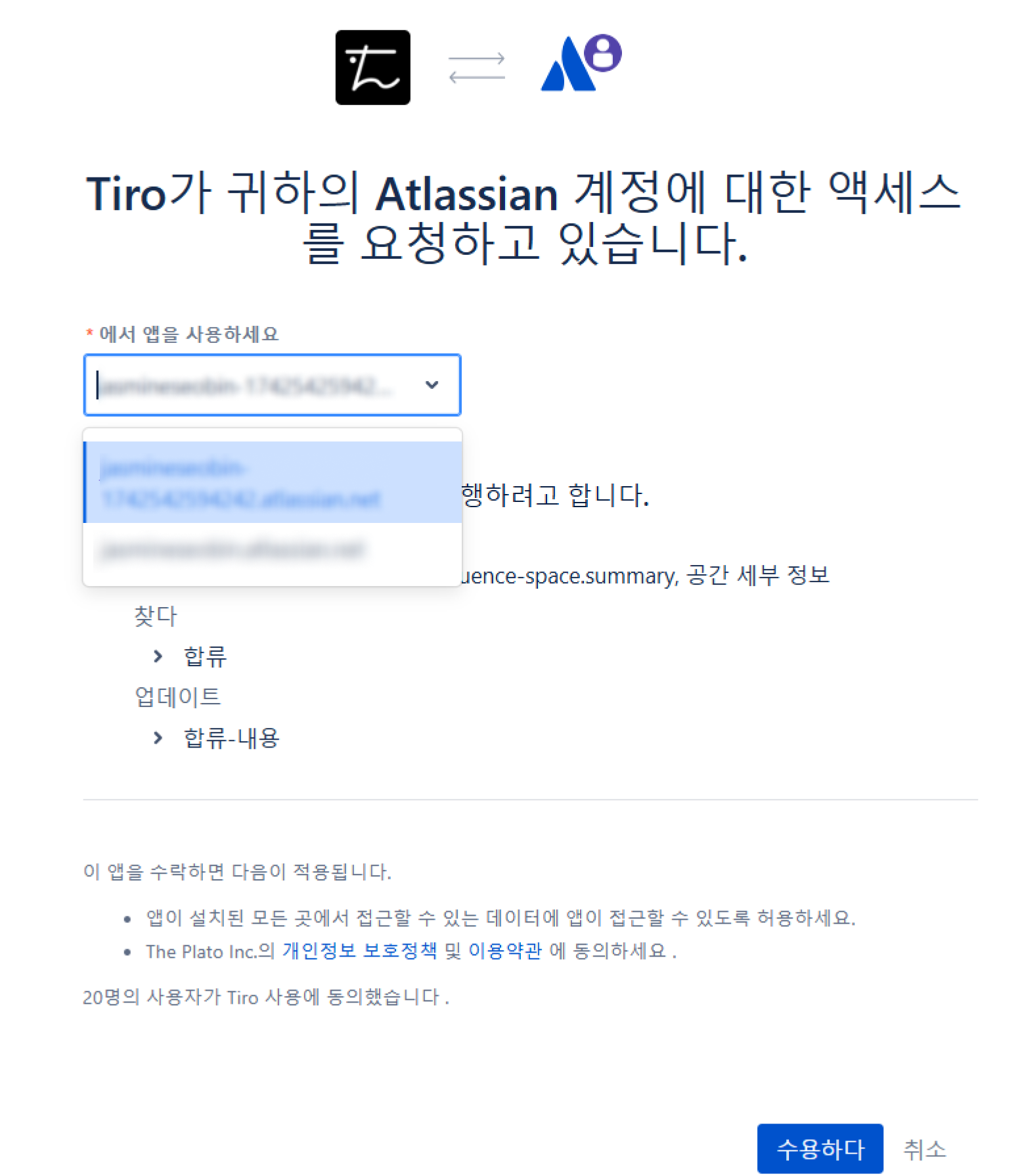 새로 뜨는 창에서 연결할 Confluence 계정으로 로그인합니다. 로그인 후 아래 페이지에서 연결하려는 스페이스를 선택합니다. 연동이 완료되면 Confluence로 자동으로 노트를 내보낼 수 있습니다.