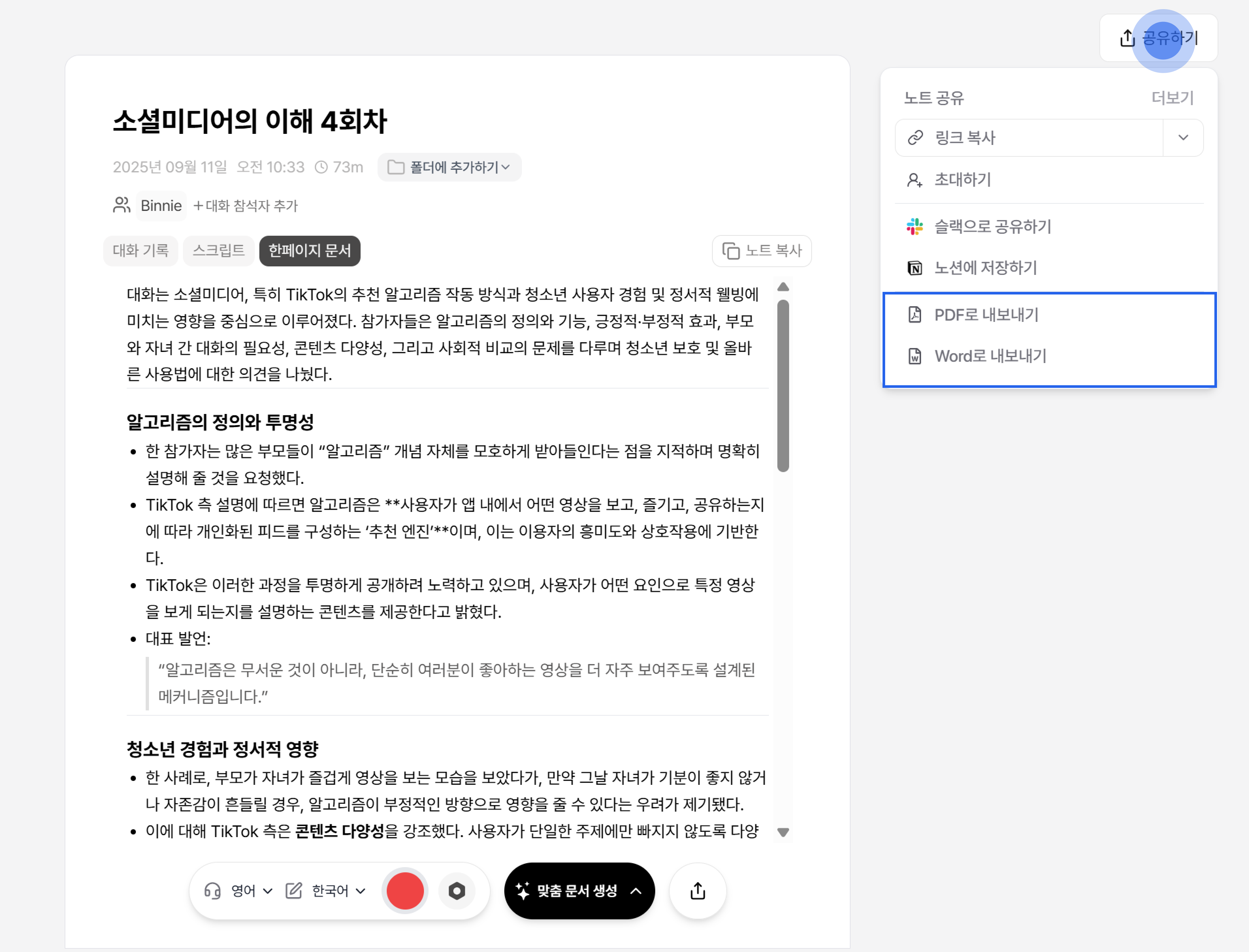 녹음 중에는 노트를 공유하거나 내보낼 수 없어요. 녹음 일시정지 상태에서만 공유하기/내보내기 버튼이 활성화됩니다.