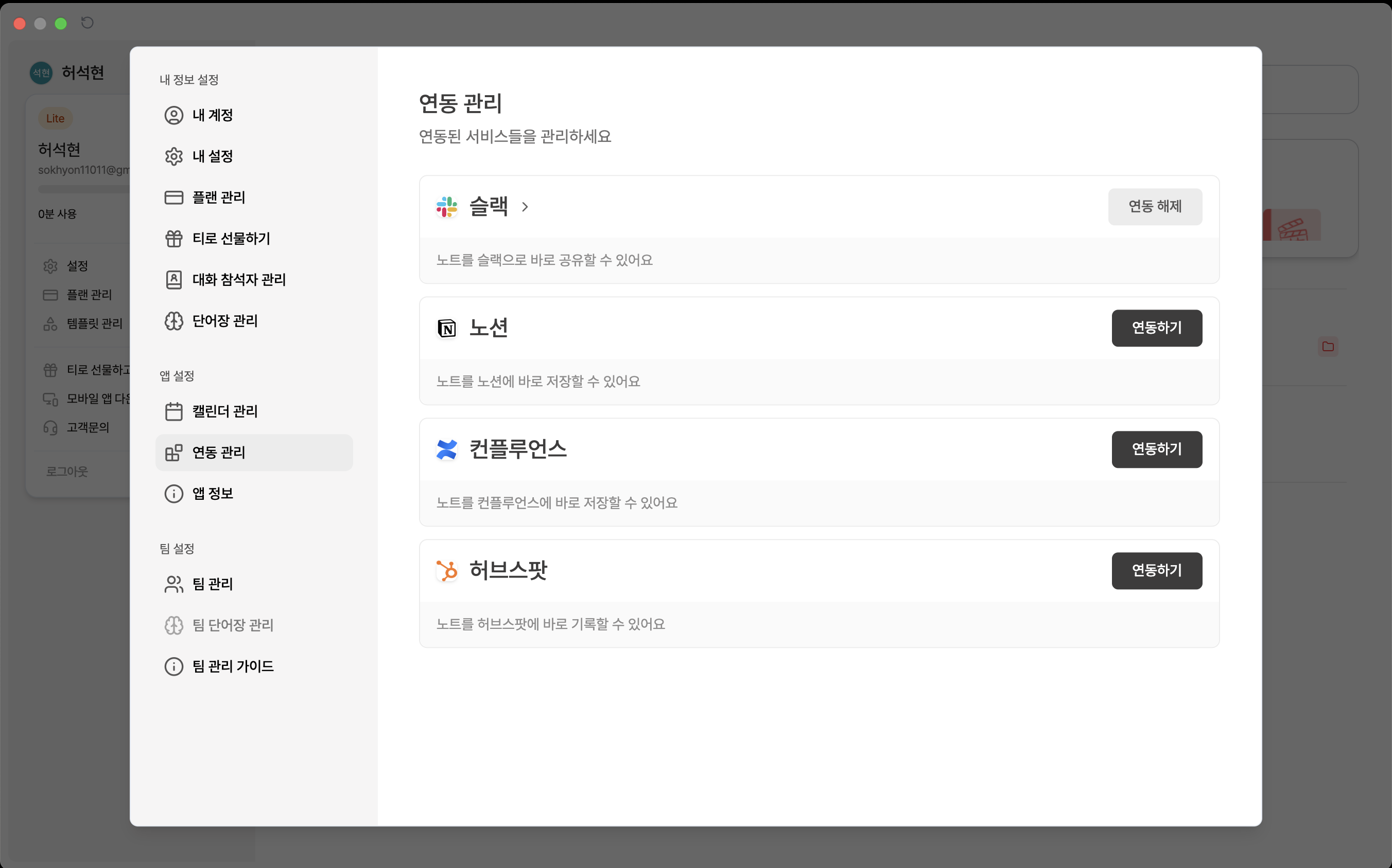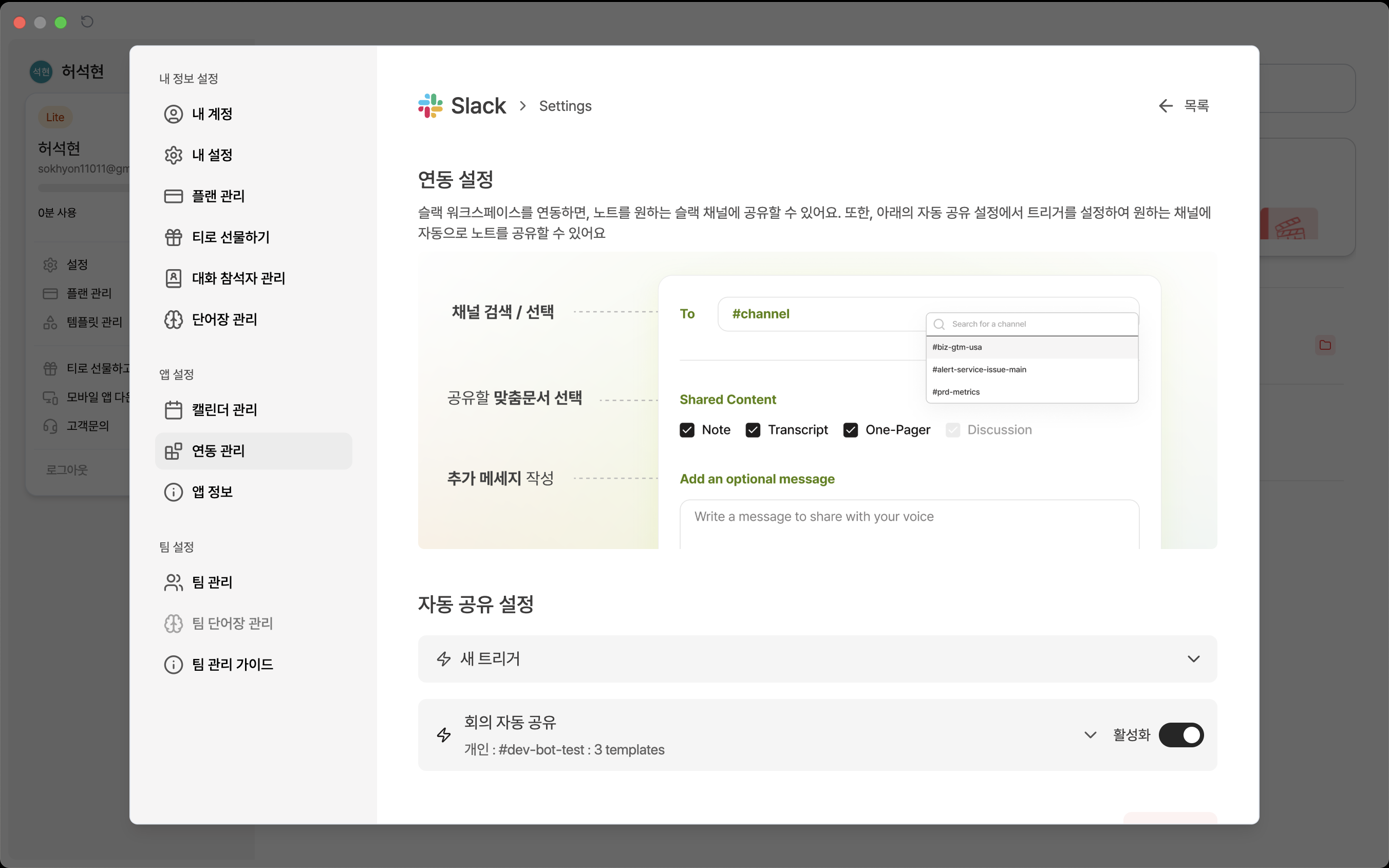 설정 위치: [설정 > 연동 관리 > "Slack" 선택 > 자동 공유 설정 섹션]