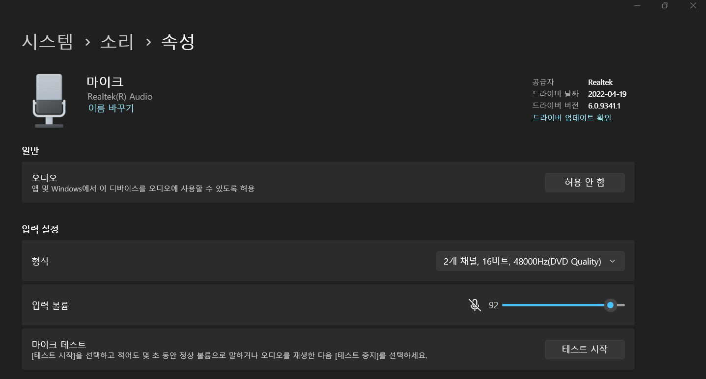 원인: 시스템에서 마이크가 음소거되어 있거나, 마이크 권한이 허용되지 않은 경우