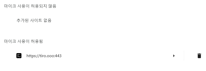 마이크 설정 페이지에서 ‘마이크 사용이 허용되지 않음’ / ‘마이크 사용이 허용됨’ 서비스 목록 중 tiro.ooo가 어디에 있는지 확인