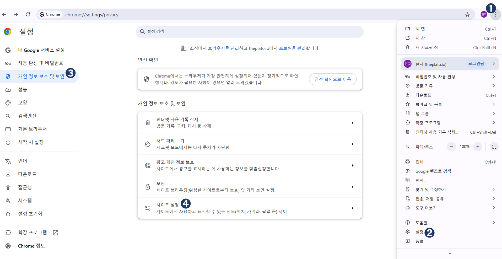 브라우저 우상단의 점 3개 줄임표 선택 > 설정 > 개인 정보 보호 및 보안 > 사이트 설정 접속