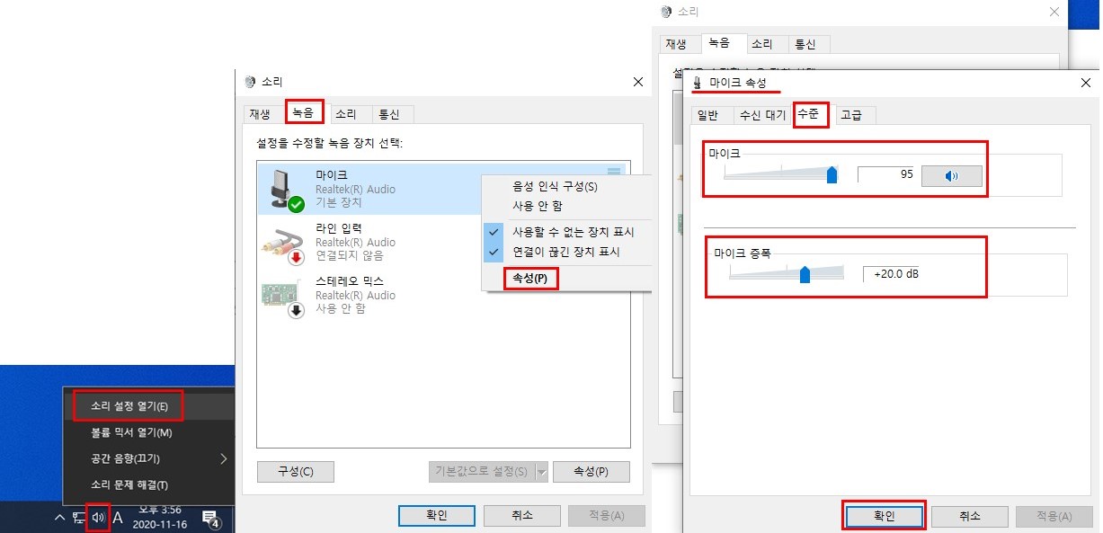 녹음 탭 선택 > 마이크 위에서 우클릭 > 속성 선택