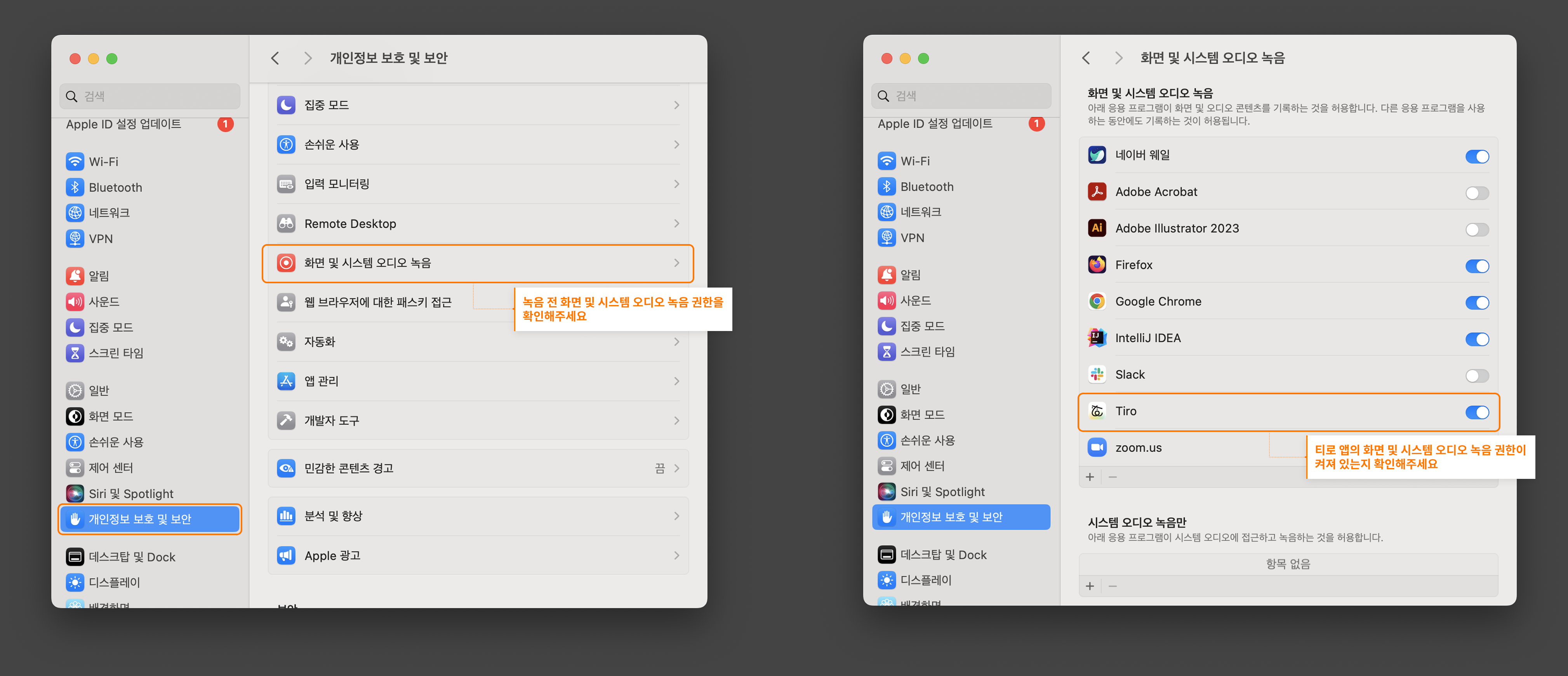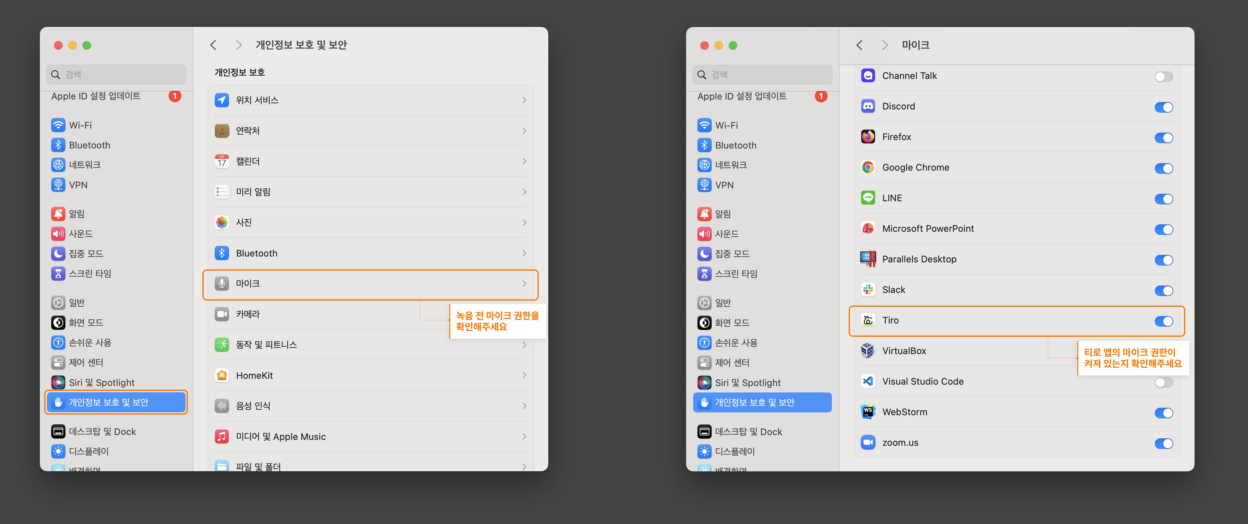 Mac에서 Tiro가 정상적으로 녹음하려면 두 가지 권한이 모두 필요합니다.