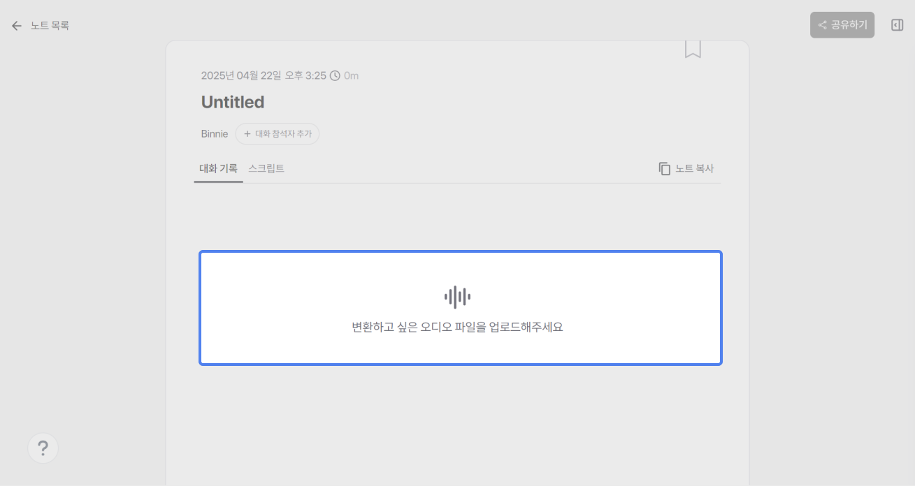 대화 참석자칸에 이메일을 입력하여 대화 상황에 함께 참여한 사람들을 추가할 수 있습니다. 참석자로 등록할 경우 대화 기록 시 참석자명을 더 정확하게 인식할 수 있으며, 기록 종료 후 생성된 노트에 더 편리하게 초대할 수 있습니다. 또한 추후 노트 검색 시 참석자를 통해 검색이 가능합니다.