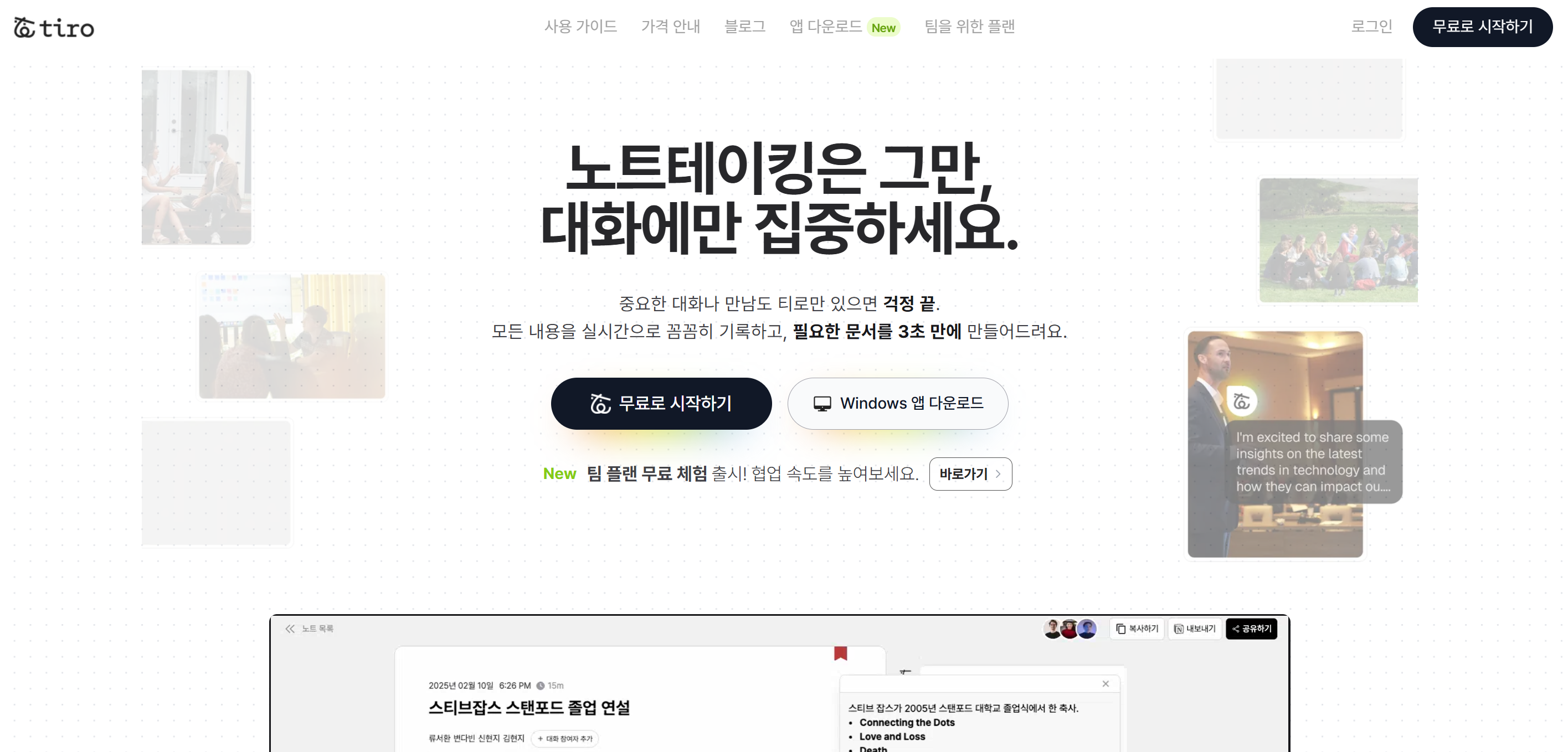 맞춤문서: 대화를 종료하면 자동으로 맞춤문서가 생성됩니다. 다른 AI 미팅노트 툴에서는 경험하지 못했던 고품질의 요약 노트를 확인해보세요. 티로는 단순 시간대별 요약이 아닌, 대화 전반의 핵심 주제별로 구조화된 요약을 제공합니다.