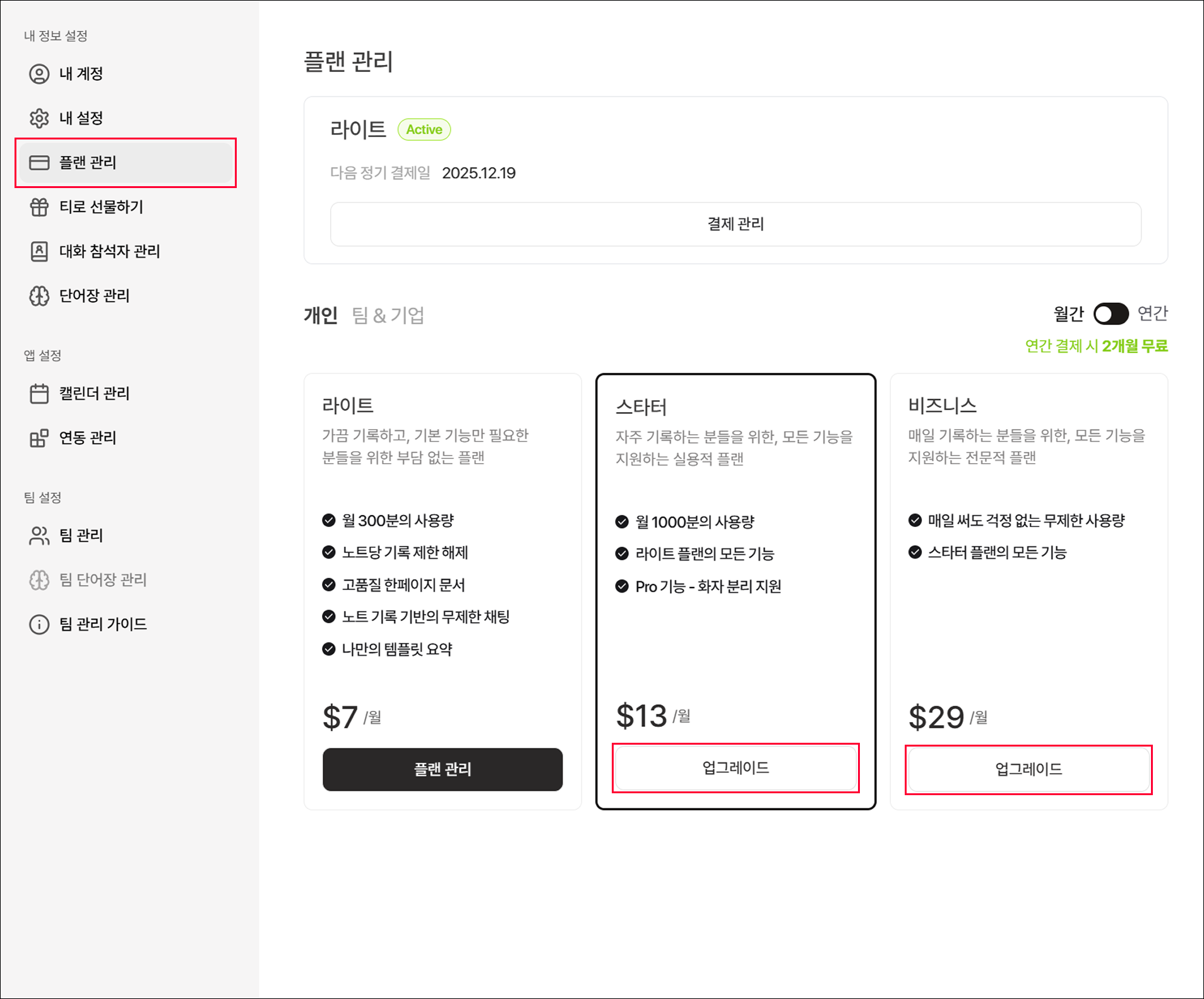 2) 월간 플랜에서 연간 플랜으로 변경