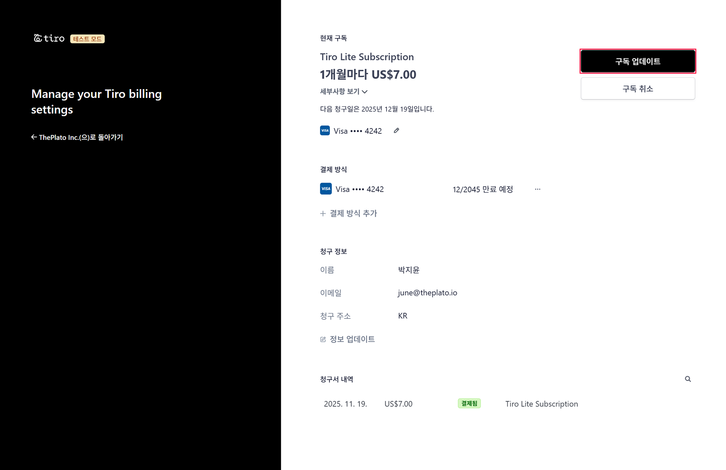 Stripe 플랜 관리 화면에서 구독 업데이트 버튼 클릭