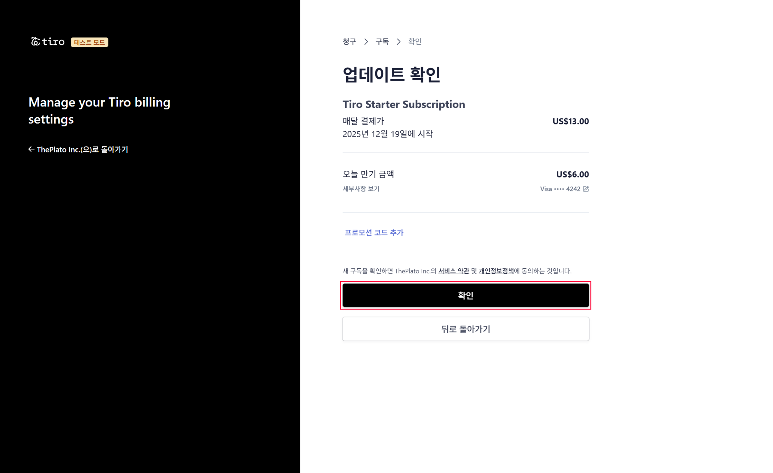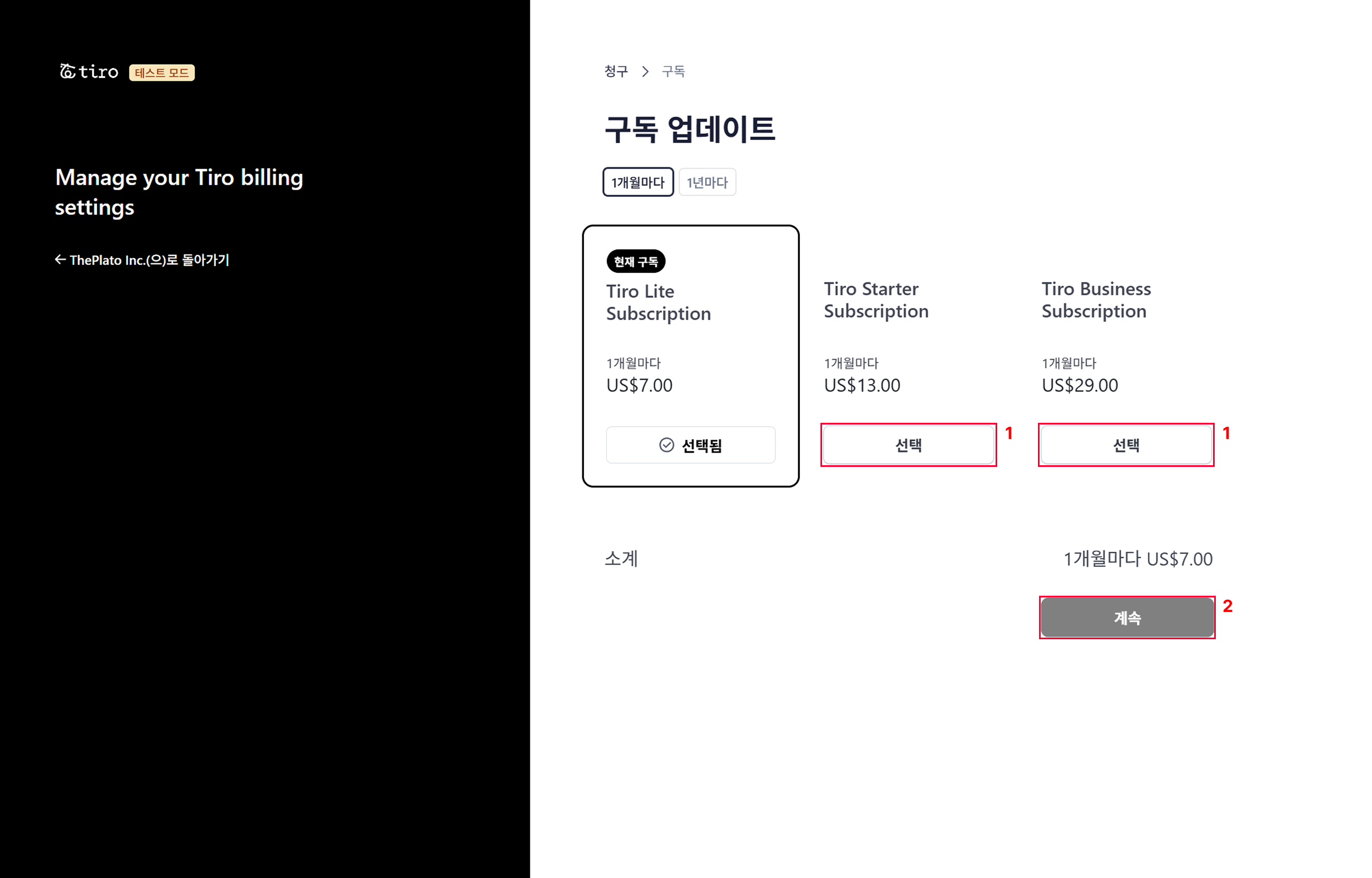 예시라이트 $7 → 스타터/프로 $13→ 즉시 결제 금액: $6