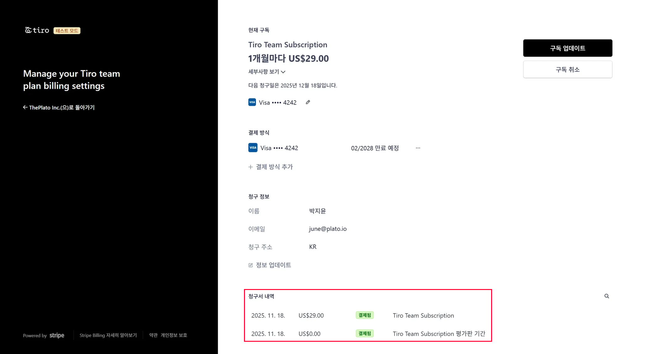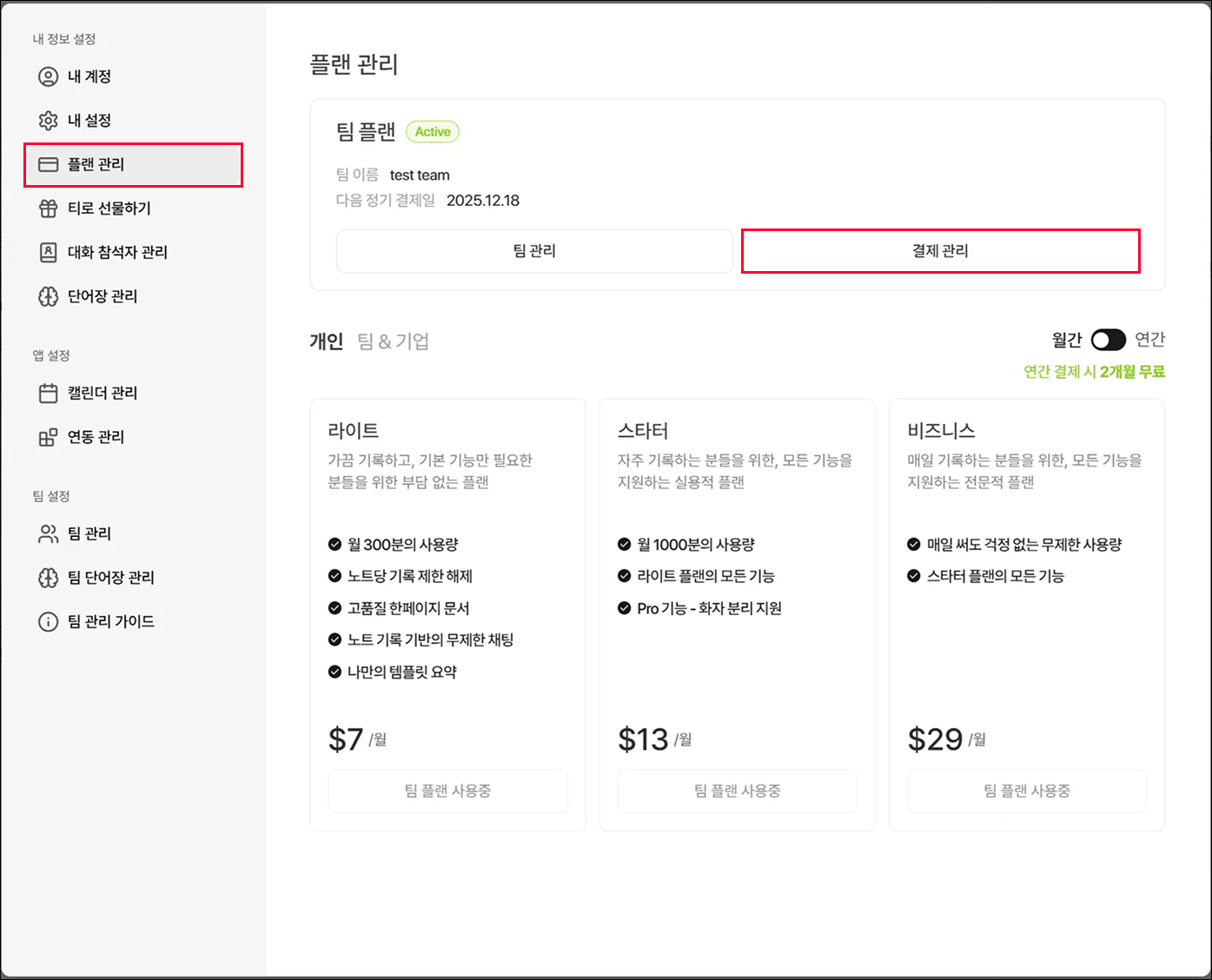 참고 팀플랜은 Stripe를 통해 결제되며, 팀 관리자만 청구서를 확인할 수 있습니다.