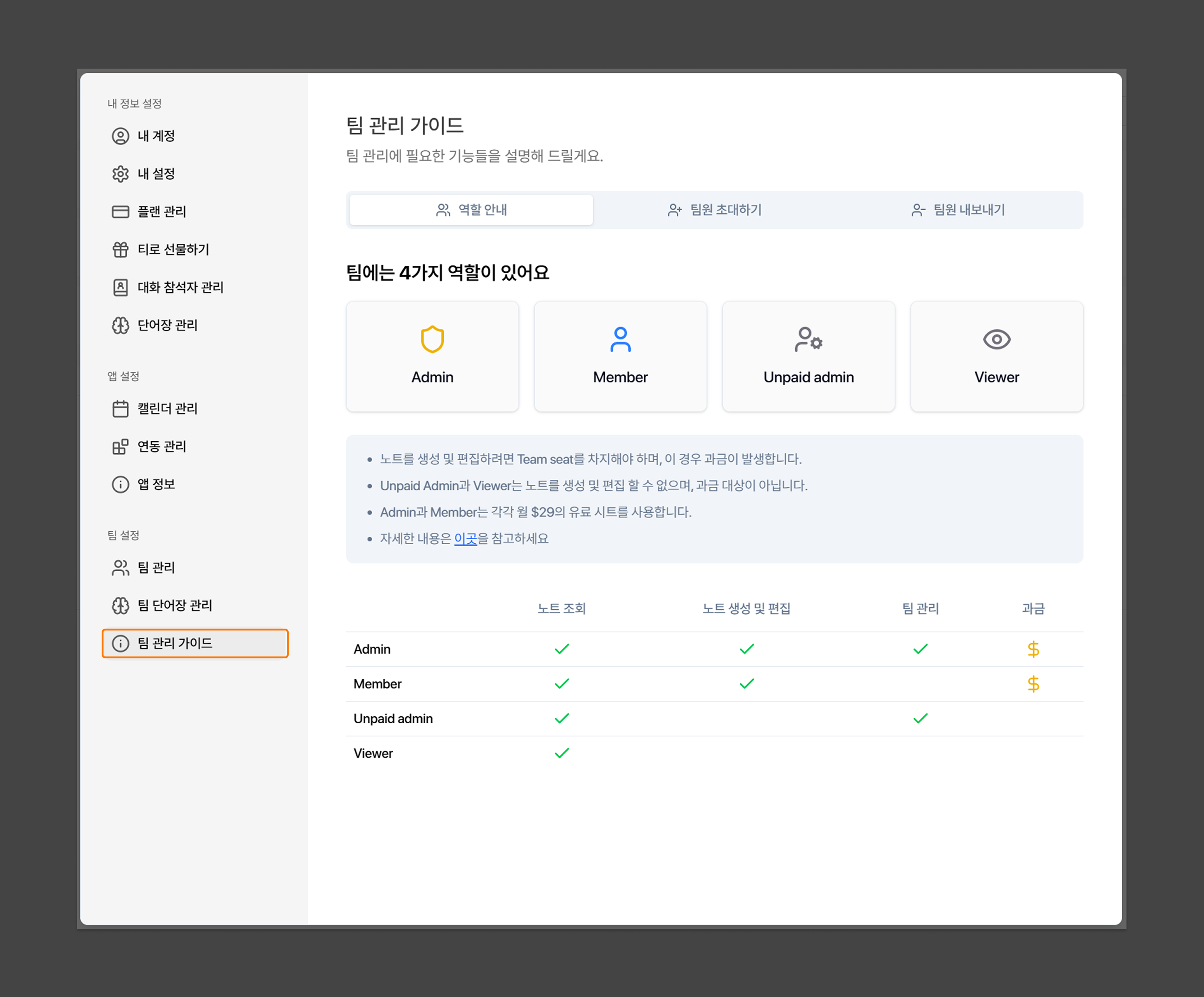 Admin과 Member는 각각 월 $29의 유료 시트를 사용합니다. Unpaid Admin과 Viewer는 과금되지 않습니다.