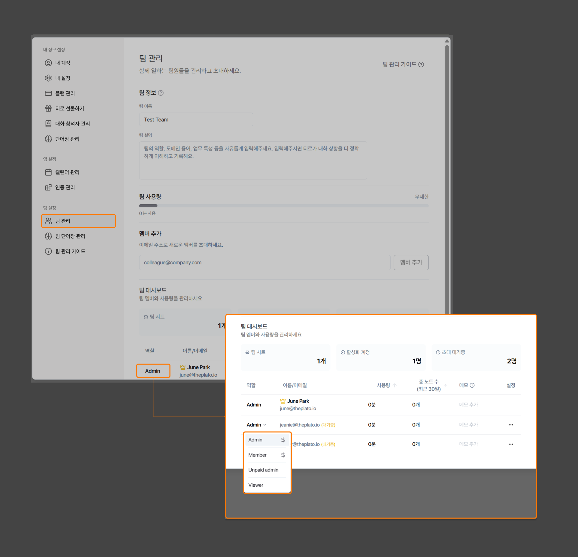 팀의 Admin 또는 Unpaid Admin이 설정에서 멤버의 역할을 변경할 수 있습니다.