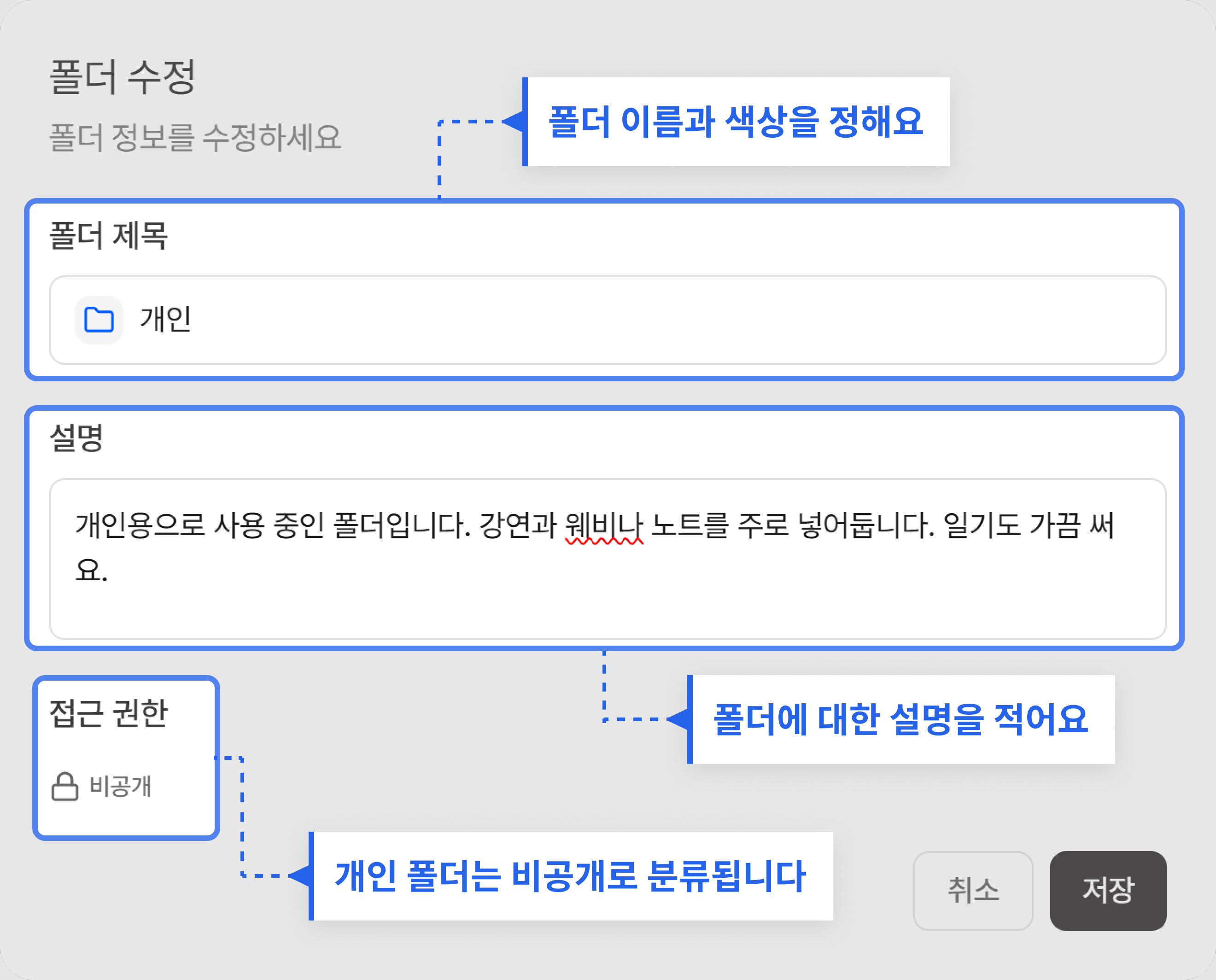 폴더 옆 … 버튼을 눌러 폴더 수정를 클릭하면 폴더 설정창이 나옵니다. 폴더 설정창에서 폴더의 색상과 이름, 설명을 지정해보세요.