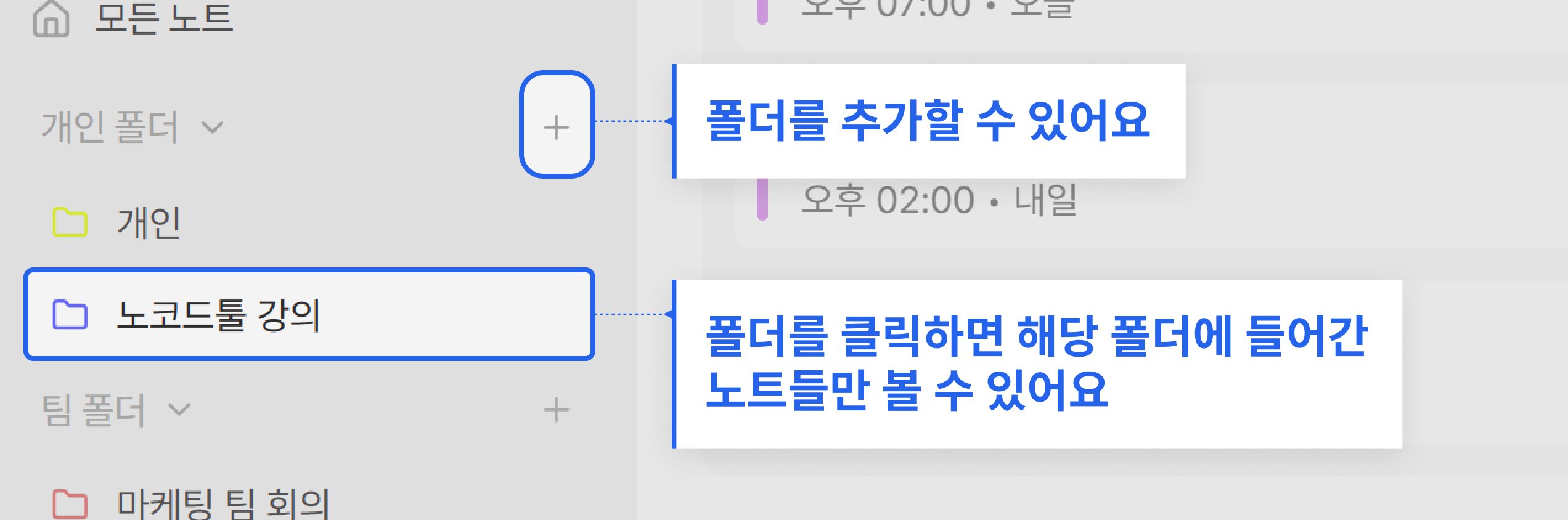 노트 제목 오른쪽에서 폴더를 지정할 수 있습니다. 한 노트를 여러 폴더로 중복 분류하는 것 역시 가능합니다. 폴더 지정을 통해 노트를 더 효율적으로 관리해보세요. 또한, 노트를 공유하더라도 폴더는 공유되지 않으니 걱정 마세요.