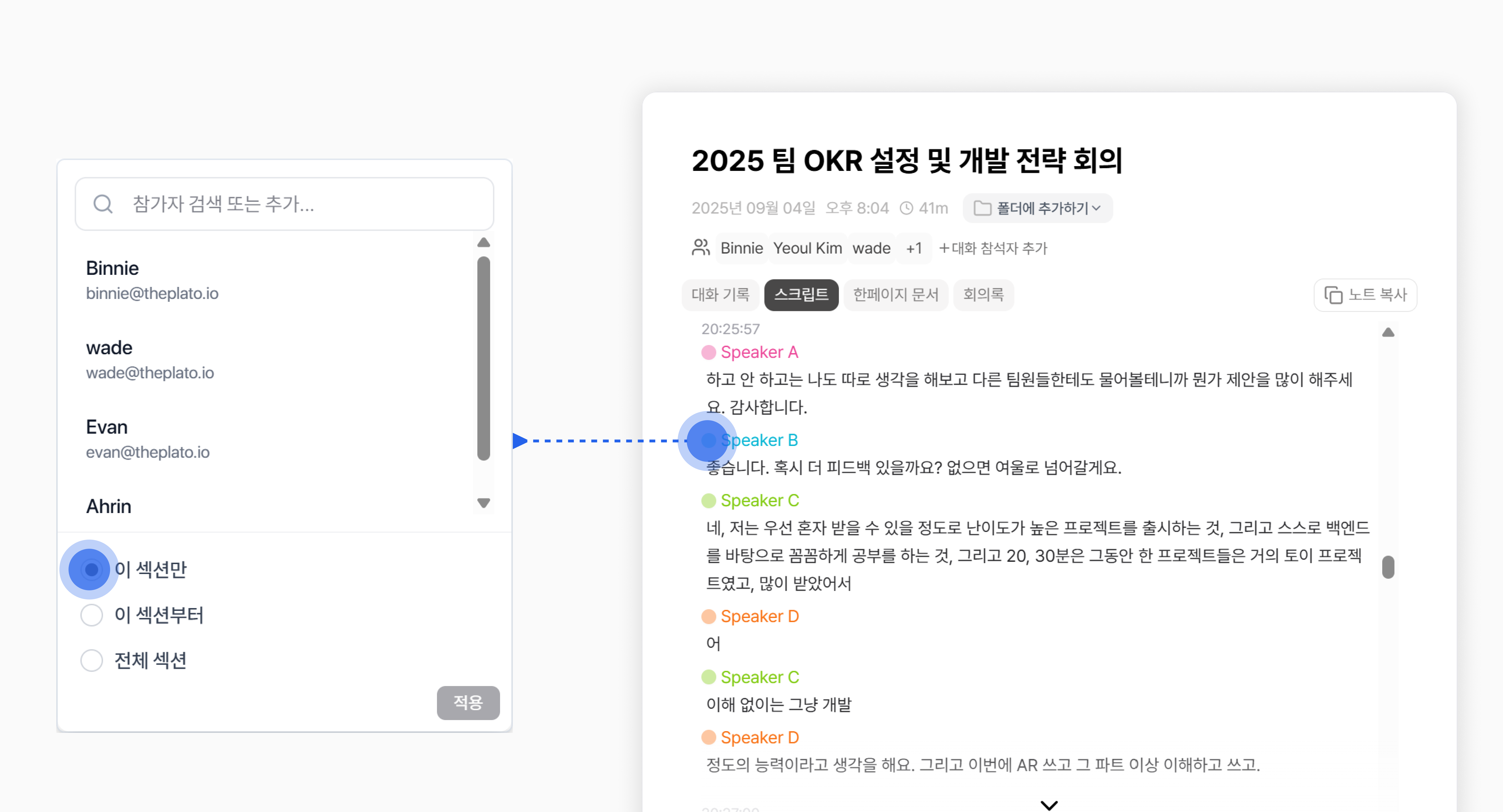 [스크립트] 탭에 자동으로 붙어있는 Speaker A, Speaker B,.. 와 같은 태그를, 원하시는 대화 참석자 이름으로 수정하는 방법은 다음과 같습니다.