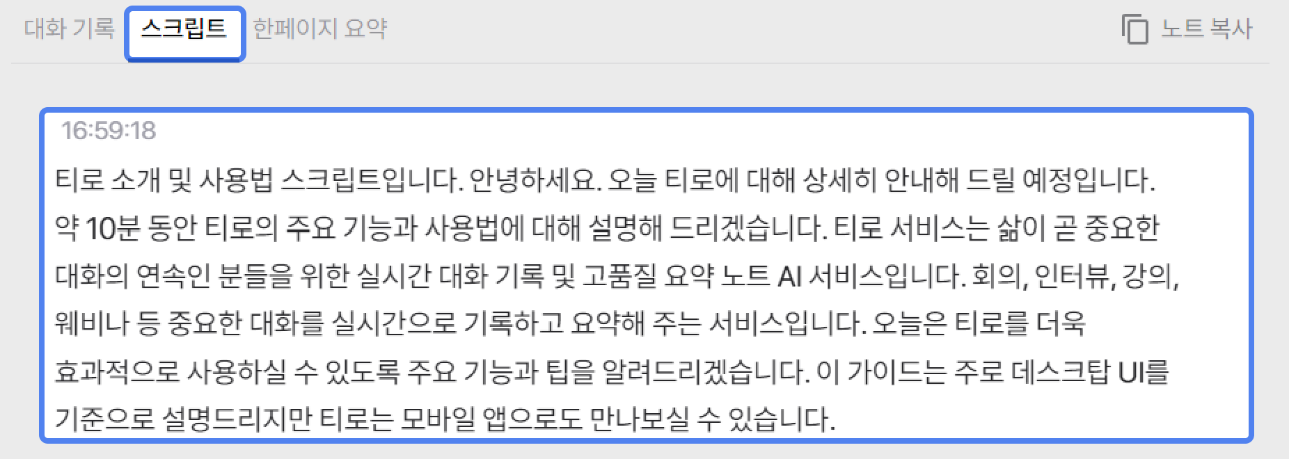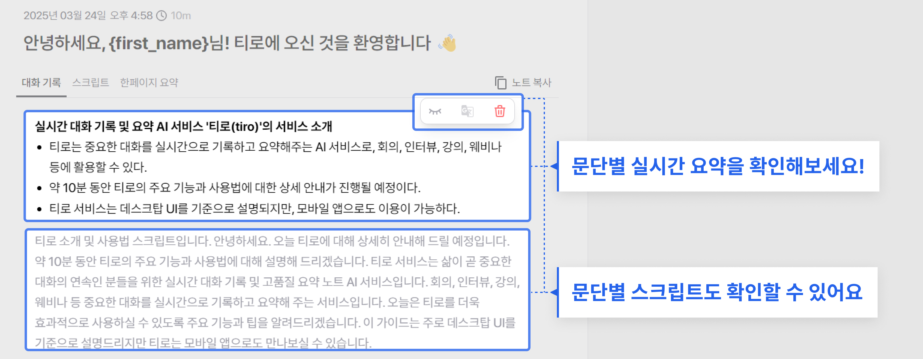 대화기록은 실시간으로 생성되는 문단별 요약으로, 5-6문장이 쌓이면 한 문단이 됩니다. 문단이 분리되고 나서 더 좋은 품질의 문단이 생성되니 티로가 대화 내용을 곱씹을 때까지 조금만 기다려주세요.