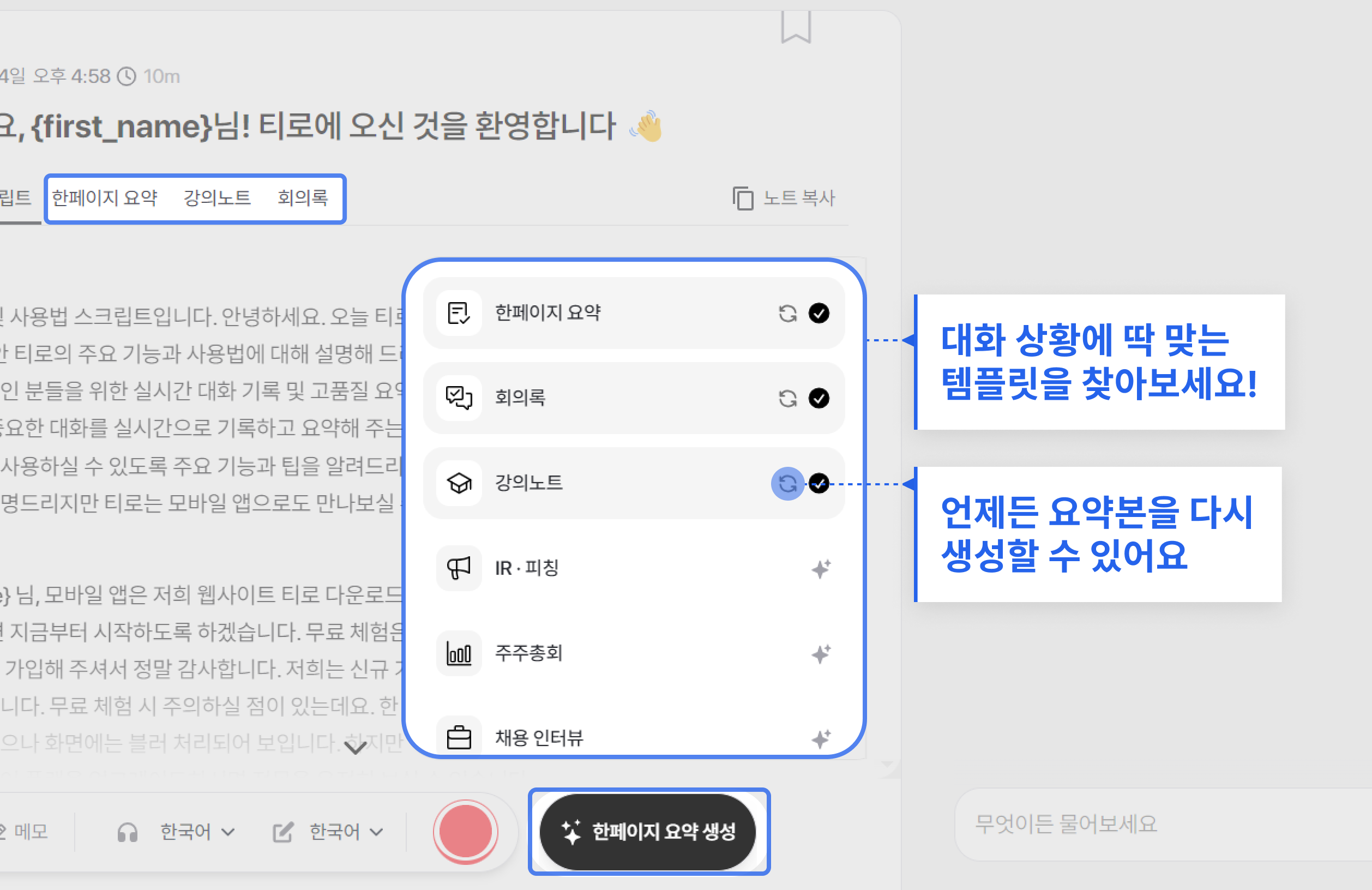 강의노트, 주주총회, 회의록, 채용인터뷰 등 다양한 대화상황을 위한 티로 기본 템플릿이 준비되어 있어요. 10여개의 템플릿 중에서 딱 맞는 맞춤 문서 템플릿을 찾아보세요.